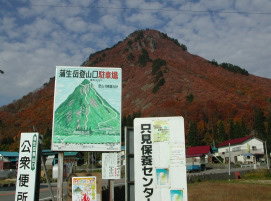 | R252にある駐車場から蒲生岳を望む。登山ルートの案内板がある | 会津蒲生駅を右手に進む |