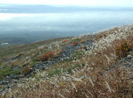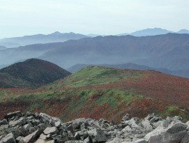 | 岩と植物のコントラスト | 色づいた南月山方向 |