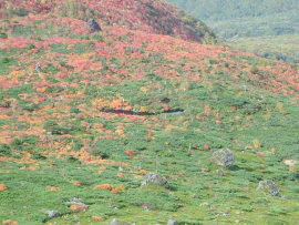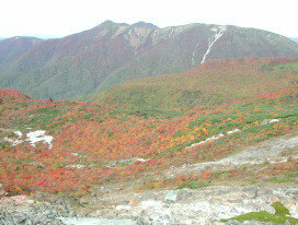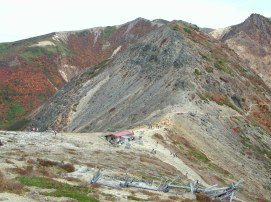 | 茶臼岳西側にある池塘の周りも紅葉が見頃 | 峰の茶屋跡と剣ヶ峰、三本槍岳へ続く稜線 |