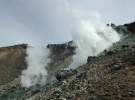 | 牛ヶ首から北西の眺め。山は流石山か?左の白い部分は姥ヶ平 | 噴気をあげる茶臼岳西側斜面 |
