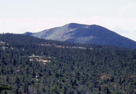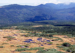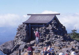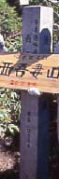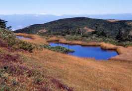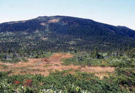 | 池塘群 | 山頂の標柱。平坦な山頂はオオシラビソの林の中 |