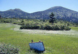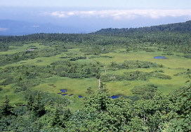 | 池塘が点在する毛無岱 | 毛無岱から大岳(右)を望む |