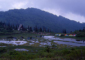 | キヌガサソウ | 高谷池を見下ろす。ヒュッテとテント群 |
