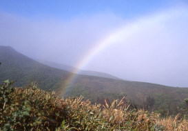 登りはじめは曇りで虹も見られた。8合目を過ぎると雨、風が激しくなって山頂に