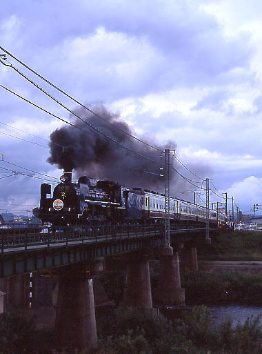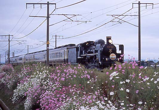 SLえちご街道号 「C57 180」によるイベント列車。02年9月29日新津〜長岡間で運行されました。 「にいつ鉄道まつり」のイベントとして稲刈りの終わった越後平野をSLが駆けました。