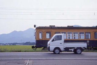 五泉駅を出発 今泉駅を出ればもうすぐ村松駅 軽トラとの競争がお似合い 撮影日 98年9月上旬 ローカル線讃歌へ